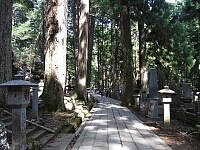 835年、空海は座禅を組み、手に大日如来の印を組んだまま永遠の悟りの世界に入ったらしい。 今も高野山奥の院で生きていると信じられ『死去』『入寂』『寂滅』などといわず『入定』というのはそのためらしい。 奥の院参道に沿って並ぶ石塔の数は10万基とも20万基とも言われ、皇族から名もない人々まで、あらゆる階層の人々が競ってここに墓碑を建立したらしい。 戦国武将の約6割のお墓があるらしい。一の橋から中の橋を経て御廟橋、御廟橋を渡ると空海入定の地とされる奥の院があり、 一番奥にある御廟では今も空海が瞑想をしているらしい。
