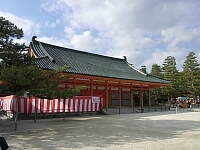 超ド級のデカさを誇る大鳥居がお出迎えしてくれました! うぉー、スゲぇデケーぇ!通りてー! てな感じでテンションが上がっていたので、大鳥居をくぐろうと思ったのですが、鳥居の下は車がビュンビュン走っていたので諦めました。 そんなこんなで、応天門という立派な楼門をくぐり境内へ。 校庭のような境内は、ベースボールができそうなくらい広く、とても空が広く感じる空間でした。 緑色の屋根と朱色の柱と白い壁、まるで竜宮城(行った事ないけど)のような社殿達。 特に、屋根がたくさんある白虎楼は私がイメージする竜宮城そのもの。 ご朱印を頂く時、巫女さんから玉手箱を授かったらどうしよ。 私のことだからすぐ蓋を開けるだろうな。わしゃ、これ以上老けたくない。これ以上ハゲたくないんだ。 そんな事より帰宅後、ネットで平安神宮の事を調べていたら、 東神苑という素敵なお庭や泰平閣という素敵な建物や日本最古の電車などなどを見逃して帰ってしまったという事実を知る。 なんてこった。嗚呼、なんてこった。今度訪れた時は、漏れなく散策しよう!